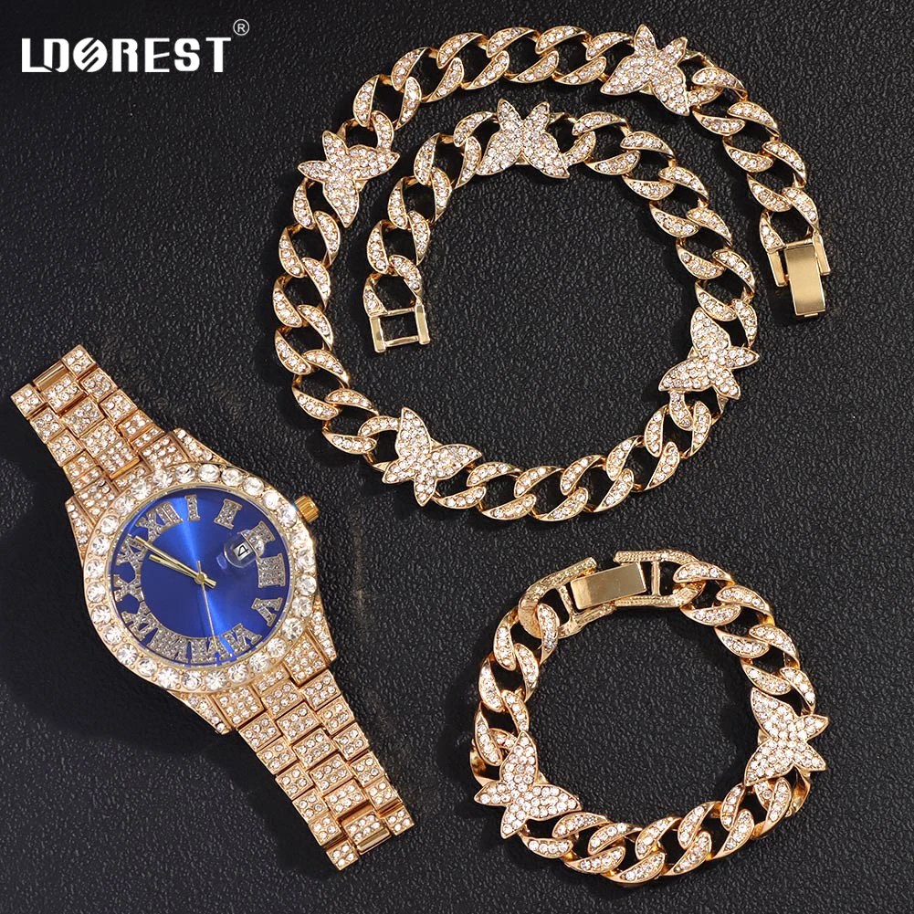 3Pcs Necklace +Watch+Bracelet Hip Hop Butterfly Miami Cuban Link Chain Necklaces For Men Women Shiny Rhinestones Rapper Jewelry