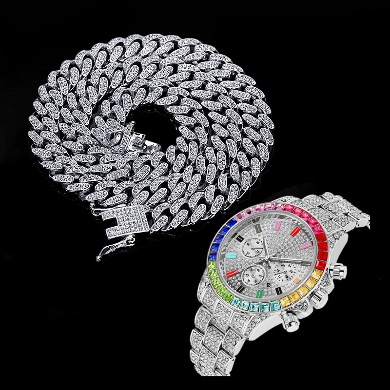 Necklace Bracelet Rapper Hip Hop Miami Cuban Chain Iced Out Paved Men Dubai Jewelry Sets for Mens Women Gold Watch Colorful Gift